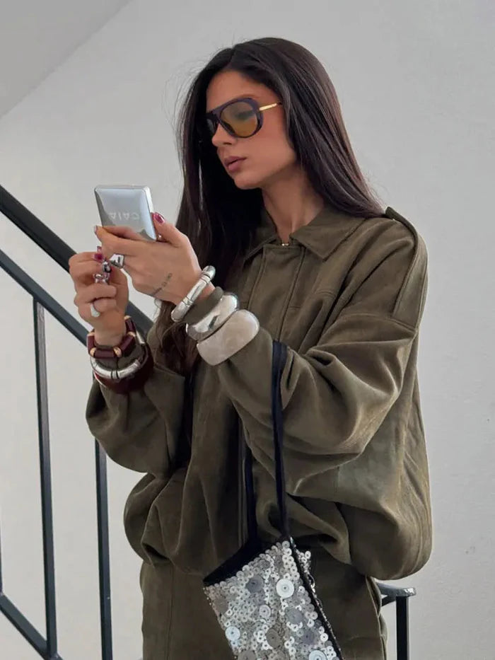 Malvina Green Transition Jacket in vintage motorcycle style combines casual cold with a modern design. The melted cut and classic collar ensure a comfortable fit, while the zipper exercise offers comfort and style. Ideal for anyone who wants to combine retro elements with current street style.